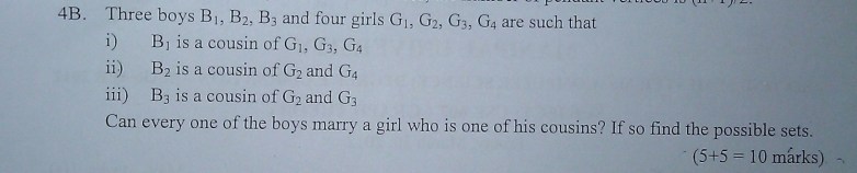 Though I knew all possible sets of guys who can marry one of their cousins, I was very much worried and had a deep concern about the girl who is single.  I tried hard, but at least one girl has to be left alone in the end. 😦